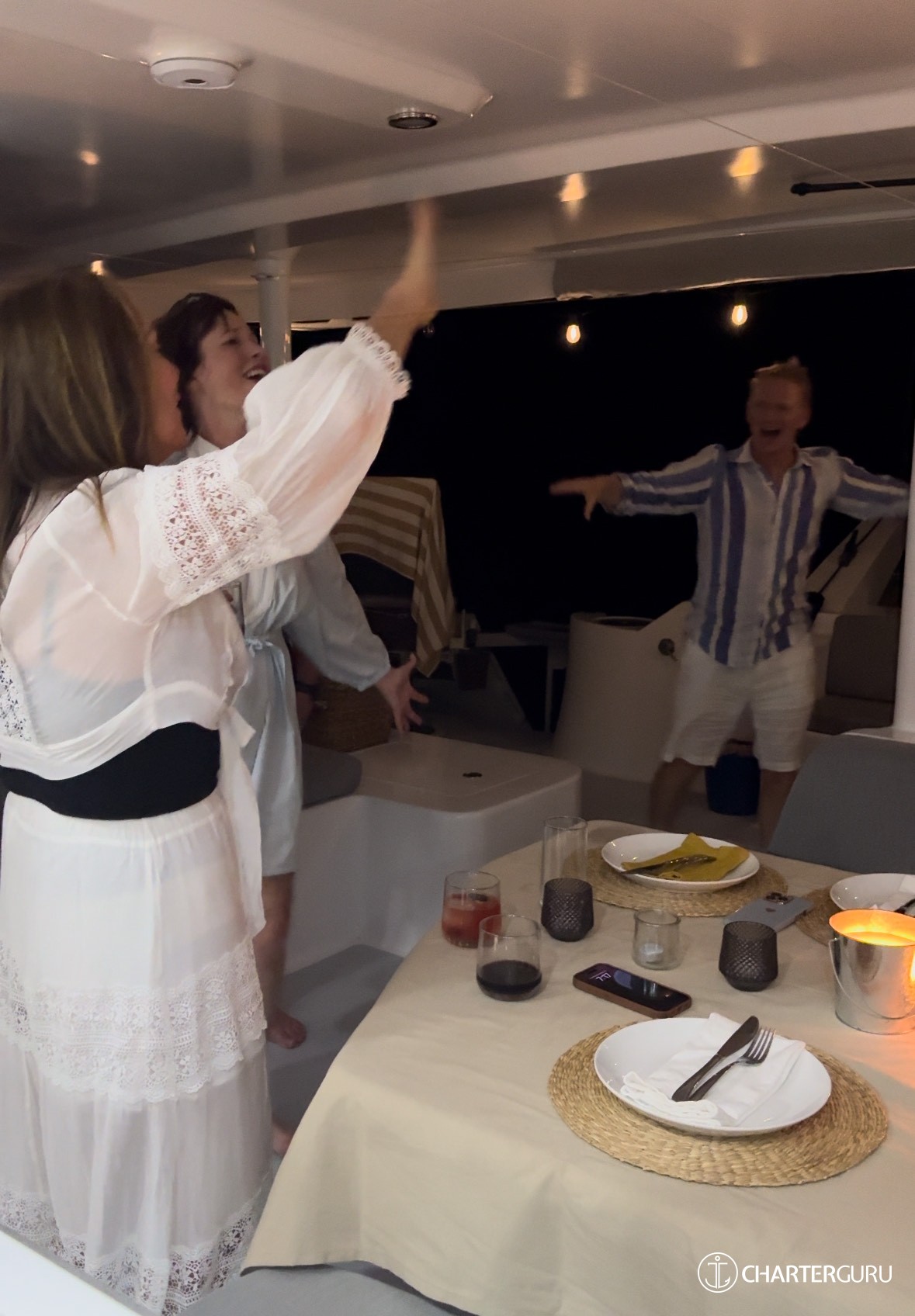 There was plenty of room to move around, so we never felt cramped or confined. The trampolines on the bow were a terrific spot to enjoy both sailing and sunset cocktails.