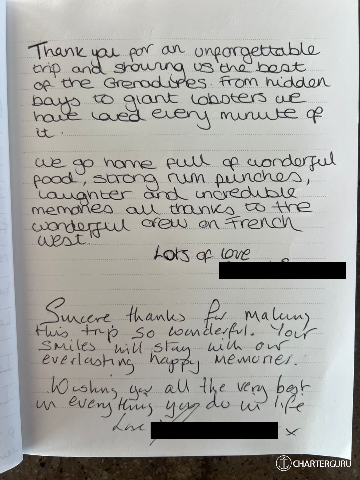 Thank you all for a trip to always remember and be grateful for. The French West is not only a beautiful boat but is run by such beautiful, capable and fun staff. Every detail was considered by the « dream team » and provided. May you continue to enjoy your position to help peoplesee the beauty of the sea.