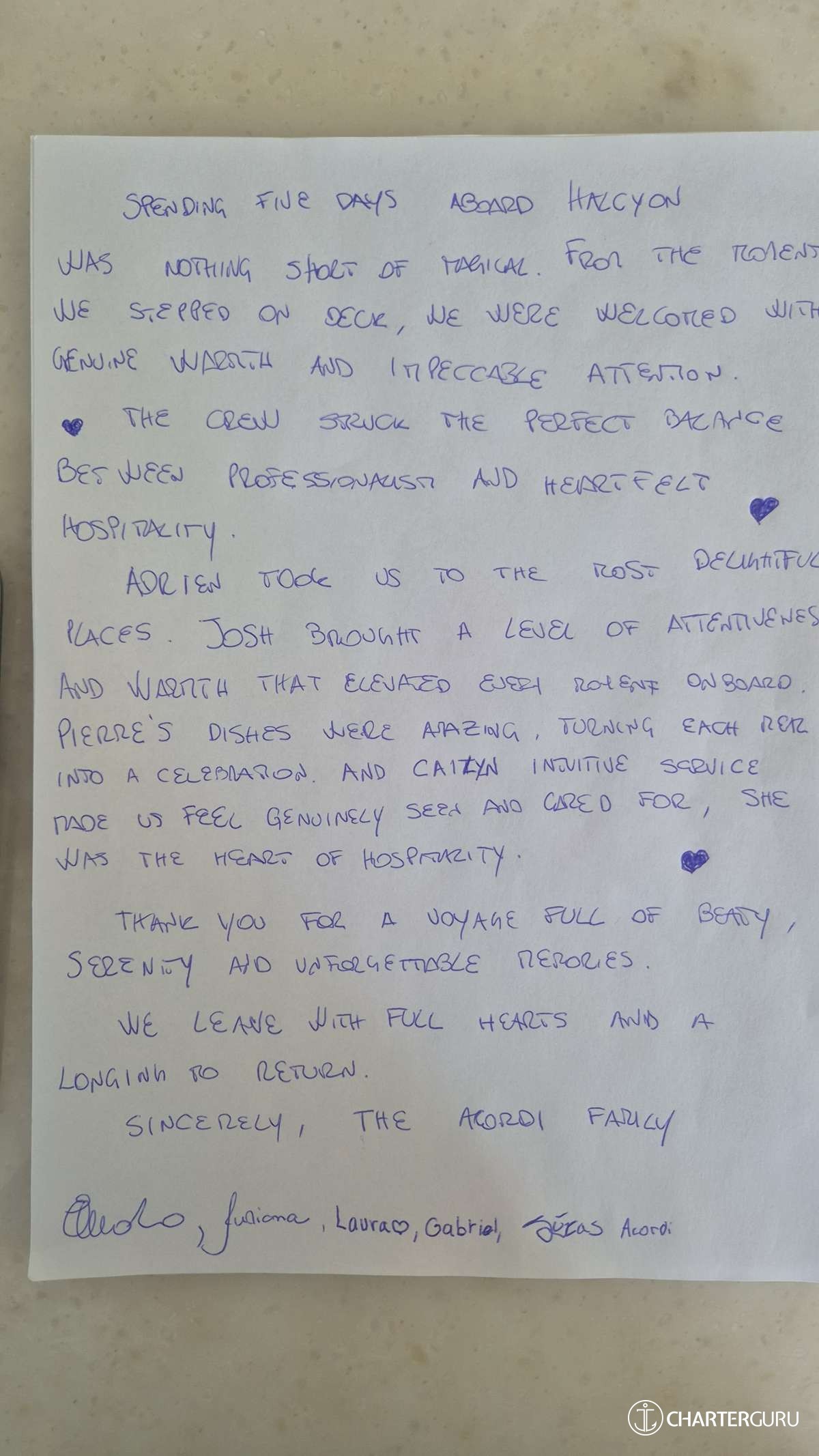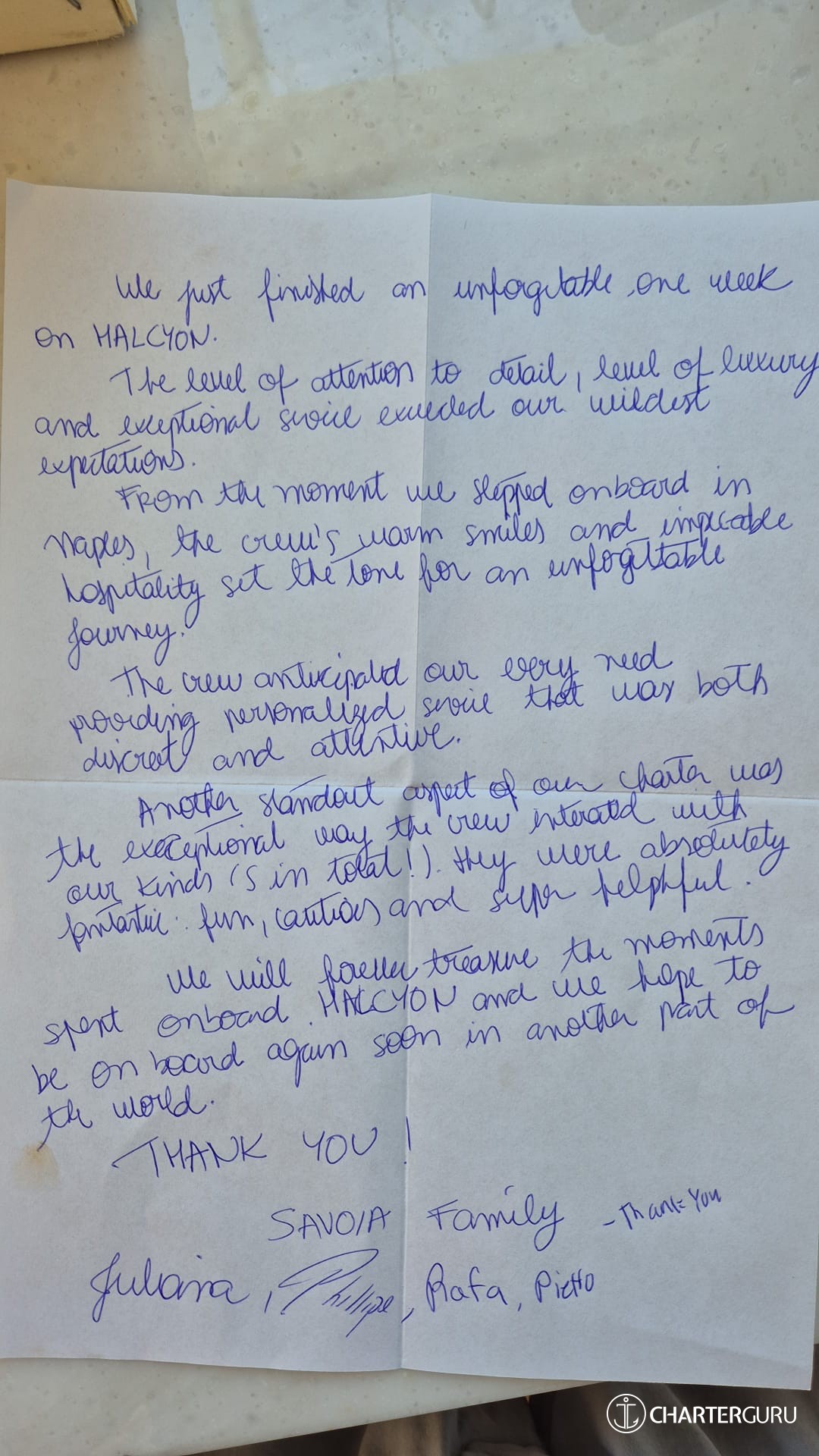 We just finished an unforgettable one week charter on HALCYON. The level of attention to detail, level of luxury and exceptional service exceeded our wildest expectations. From the moment we stepped onboard in Naples, the crew's warm smiles and impeccable hospitality set the tone for an unforgettable journey. The crew anticipated our every need providing personalized service that was both discreet and attentive. Another standout aspect of our charter was the exceptional way the crew interacted with our kids (5 in total!). They were absolutely fun, cautious and super helpful. We will always treasure the moments spent onboard HALCYON and we hope to be on board again soon in another part of the world.
