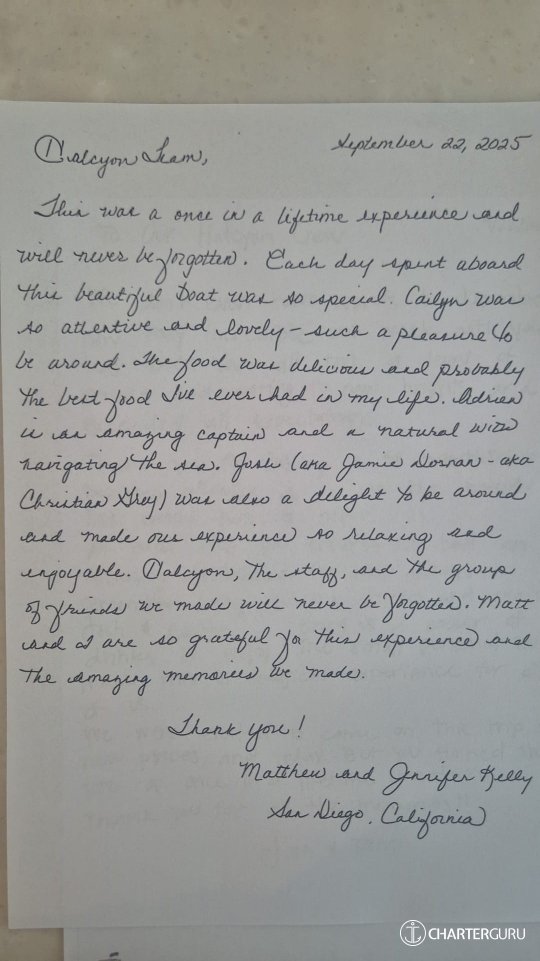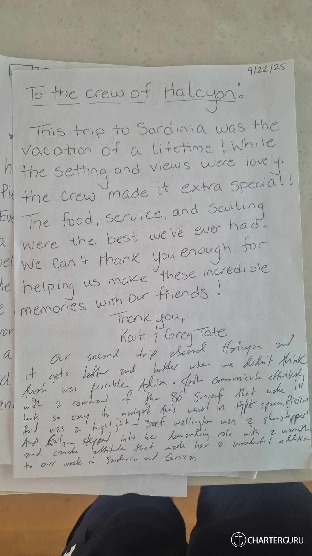 This is our second trip aboard Halcyon and it gets better and better when we didn't think that was possible. Adrien and Josh communicate effortlessly and make it look so easy to navigate this vessel in tight spaces. Pierre's food was a highlight - Beef Wellington was a showstopper! And Cailyn stepped into her demanding role with a warmth and can-do attitude that made her a wonderful addition to our week in Sardinia.