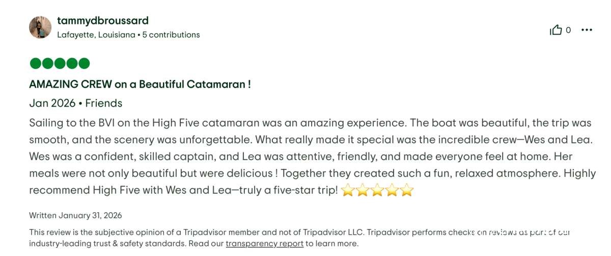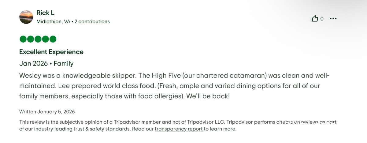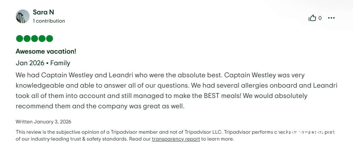 From the get go, I could tell right away that we were in safe hands with a knowledgeable captain who loves what he does. He was very patient and answered any questions that we had relating to the trip, the boat, the islands, etc. This type of vacation can make or break a trip, depending on the captain, I can say with confidence that we would feel safe and enjoy ourselves if we were to sail across the Pacific Ocean with this crew!