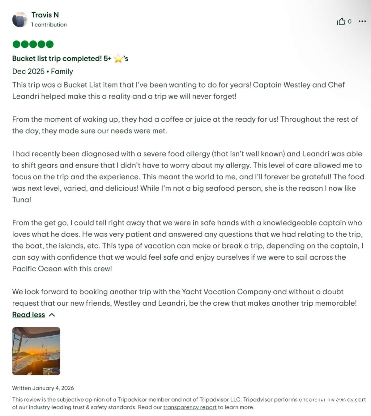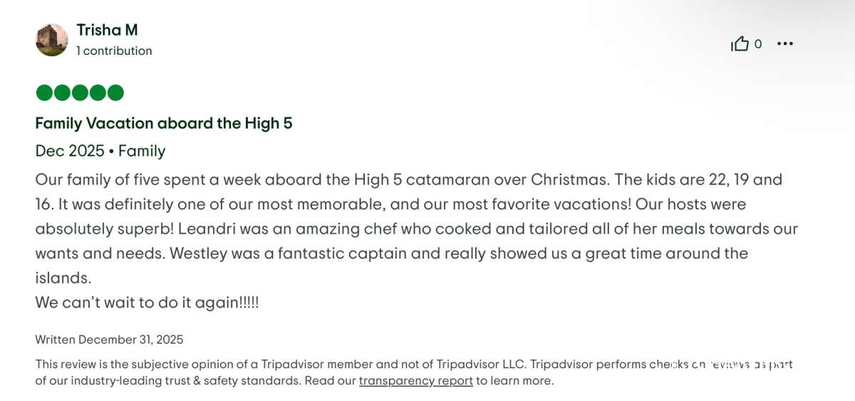 We look forward to booking another trip with the Yacht Vacation Company and without a doubt request that our new friends, Westley and Leandri, be the crew that makes another trip memorable!