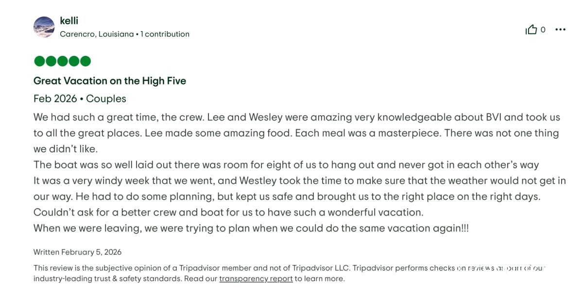 Thank you for such a wonderful trip on High 5. Everything has been first class - the food, the fun, and all the great company. Hot Tamale is the best captain/crew duo in the BVI! We will not forgot you guys.