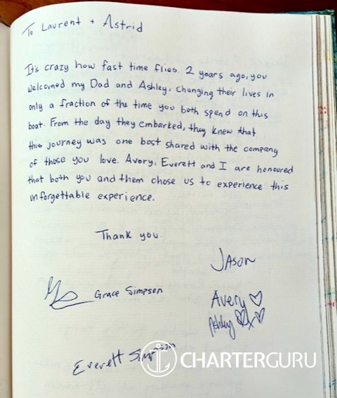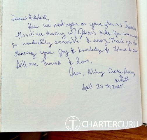 ´On behalf of my family, I want to extend our deepest thanks to you for facilitating our pairing with the Geslins on Isolablue for our charter! We all feel like we won the lottery! Of course, Isolablue is a beautiful vessel, but Laurent & Astrid are two of the loveliest people we have ever met.Their kindness, graciousness, and charm made this past week one of the most wonderful and memorable of our lives. We will always treasure our time with them.They were accommodating beyond any expectations, and ´spoiled´ us as we have never been ´spoiled´! We feel that we have made life-long friends.