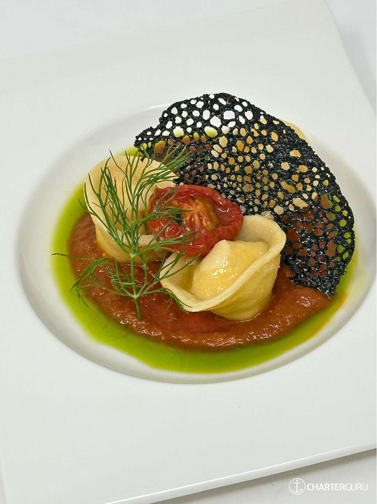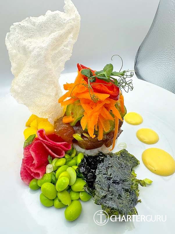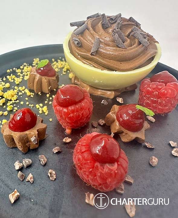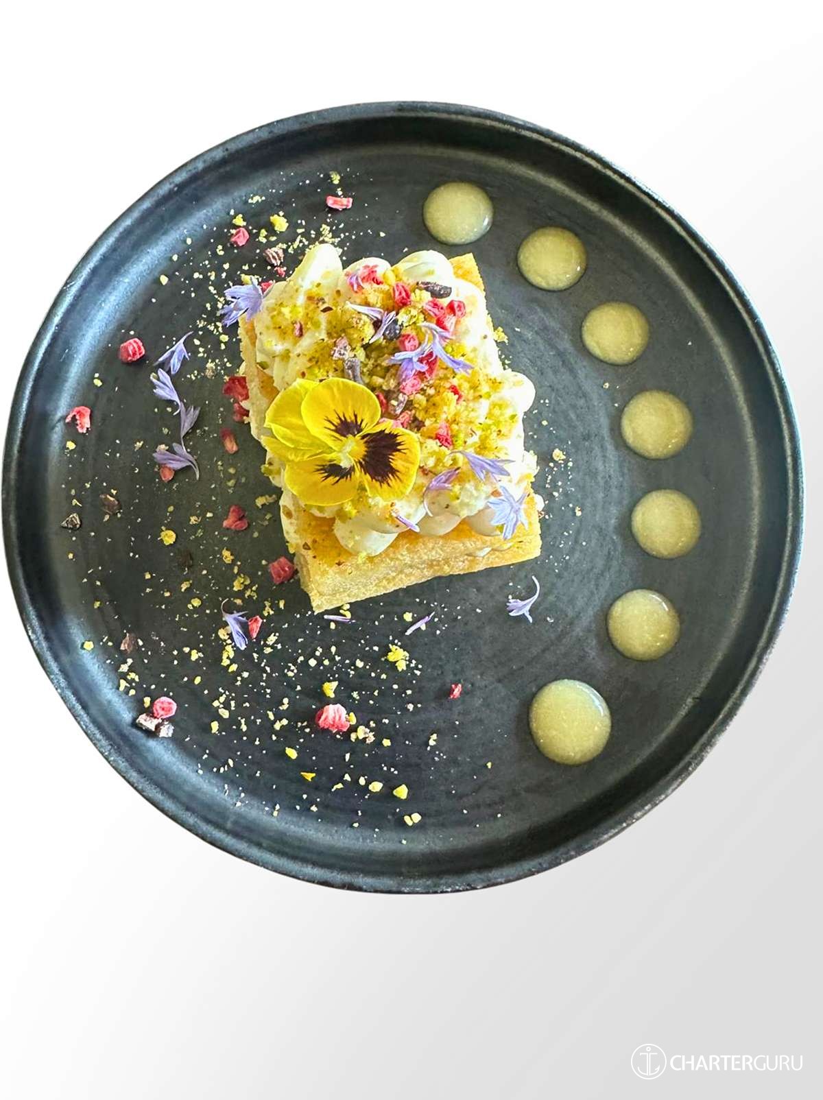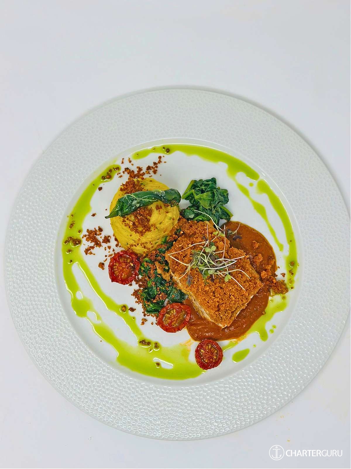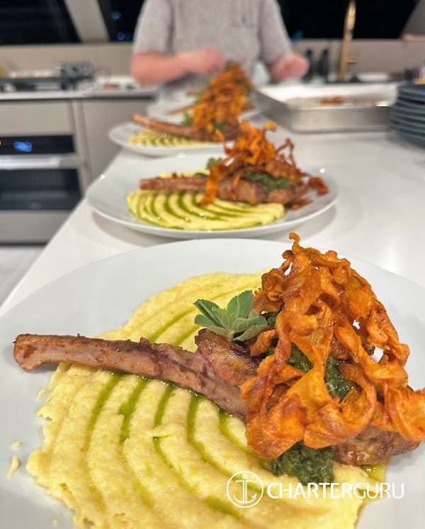 The crown jewel of Nauti Nickel is her flybridge skylounge, an elevated retreat with panoramic views, a jacuzzi, cocktail bar, BBQ grill, and plush lounges perfect for stargazing or social gatherings. Inside, the salon evokes the comfort of a luxury villa with urban-chic styling, premium Miele appliances, and climate-controlled elegance. Dining is an experience in itself, with vibrant breakfasts, beachside lunches, and candlelit dinners presented as artful, flavorful creations that fuel both body and spirit. Every detail — from tableware to presentation — reflects a commitment to excellence and joy.