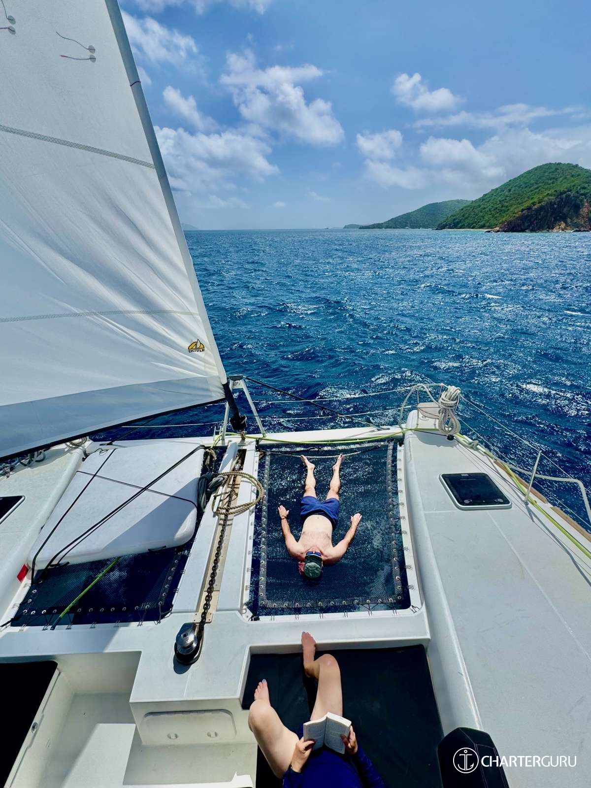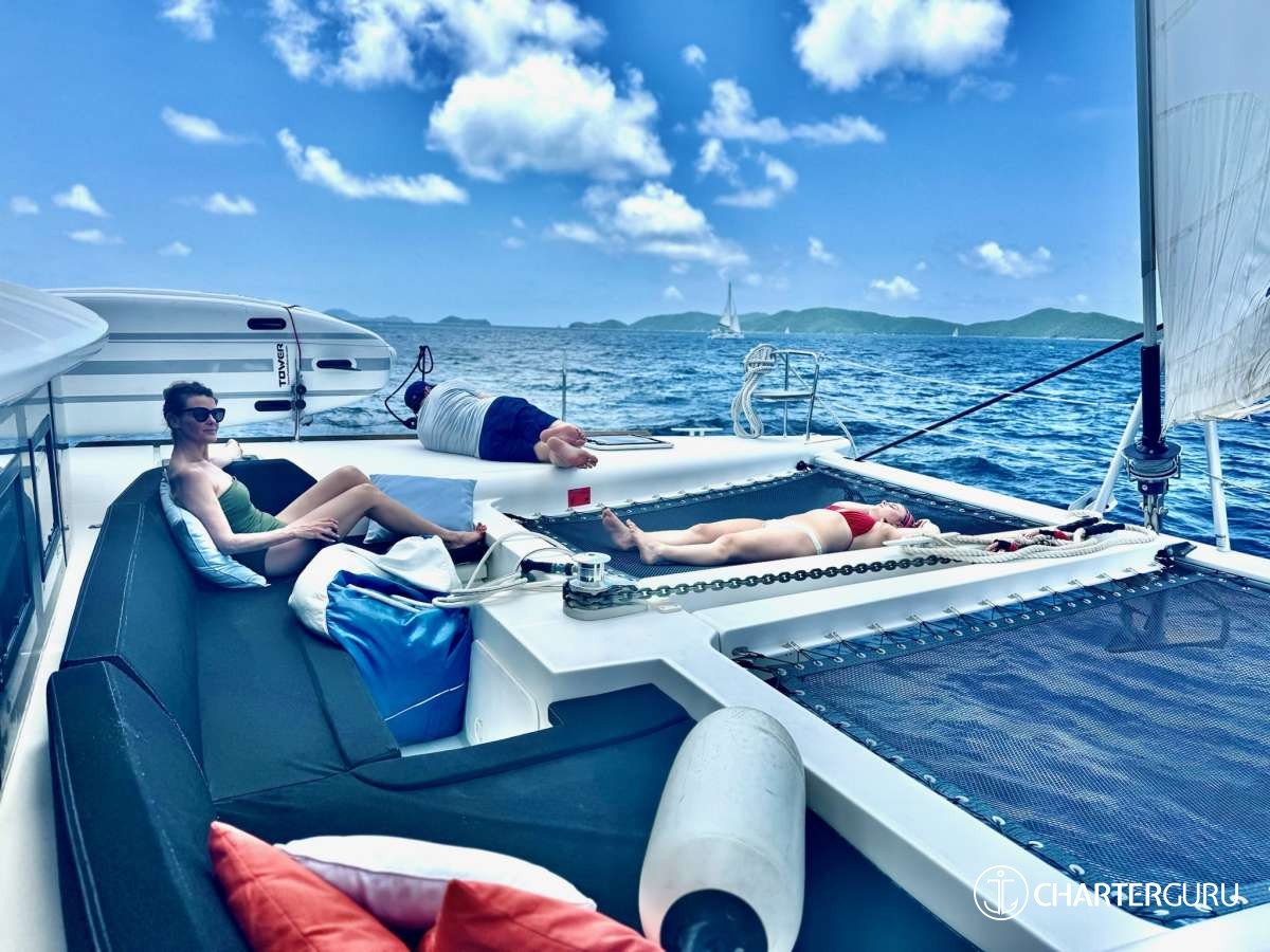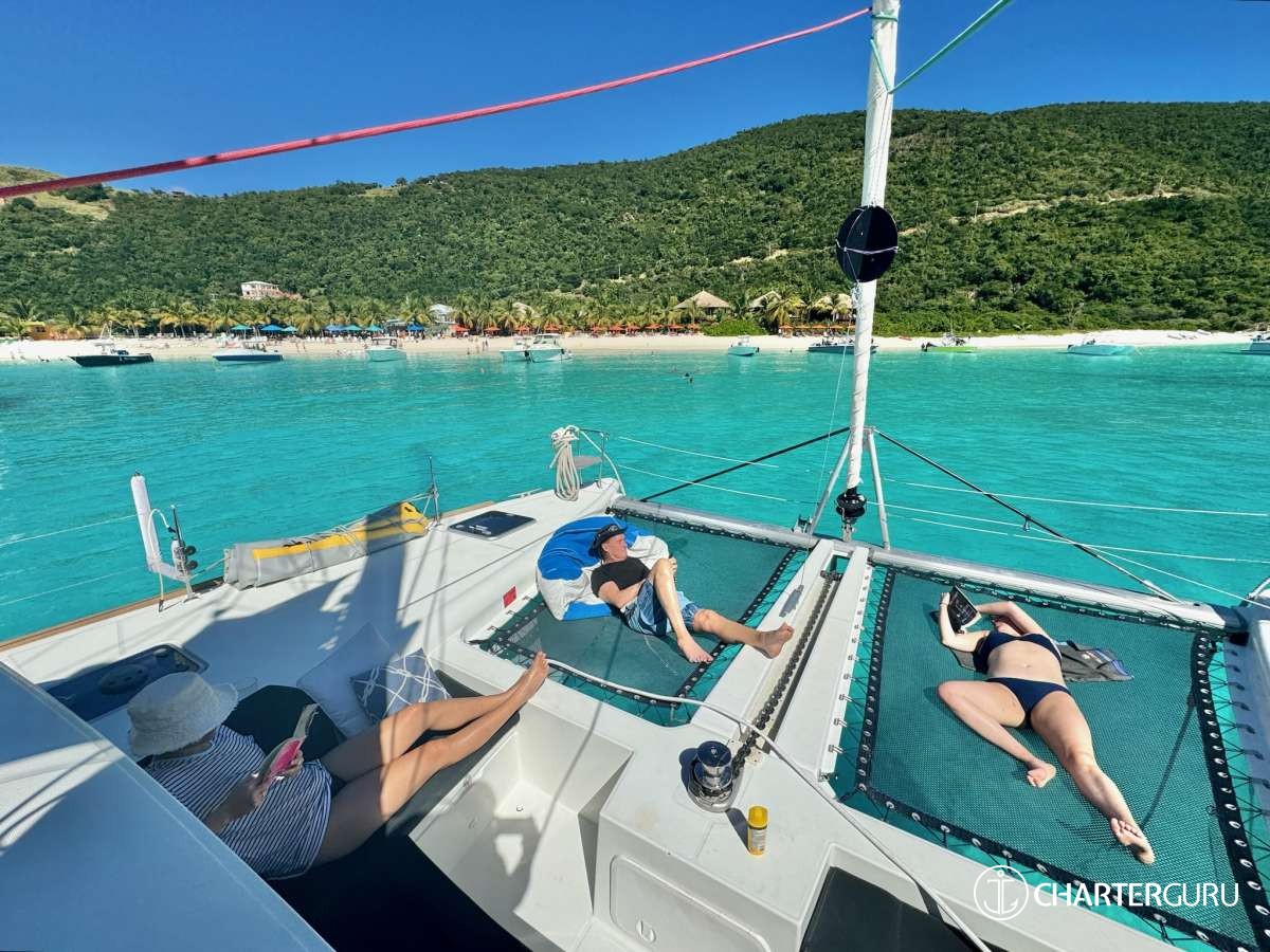 Rapscallion is a superb example of a 2018 45' Lagoon Catamaran with 3 queen cabins each with private ensuite baths including electric heads, vanity and separate showers. She boasts multiple areas for all 6 guests to sit and relax or sip a cocktail and enjoy the cool trade winds of the beautiful Virgin Islands! Furthermore, the salon has more than enough space for all guests to be comfortable for lounging or dining. The exterior aft deck also offers alfresco dining for 6 guests, top deck seating and a lounge area in front of the helm plus a forward lower deck lounge area behind trampolines. Water toys include snorkeling gear, floating mats, two stand-up paddleboards, and 2 fishing rods. Rapscallion and its award-winning crew offer nothing less than a charter of a lifetime!