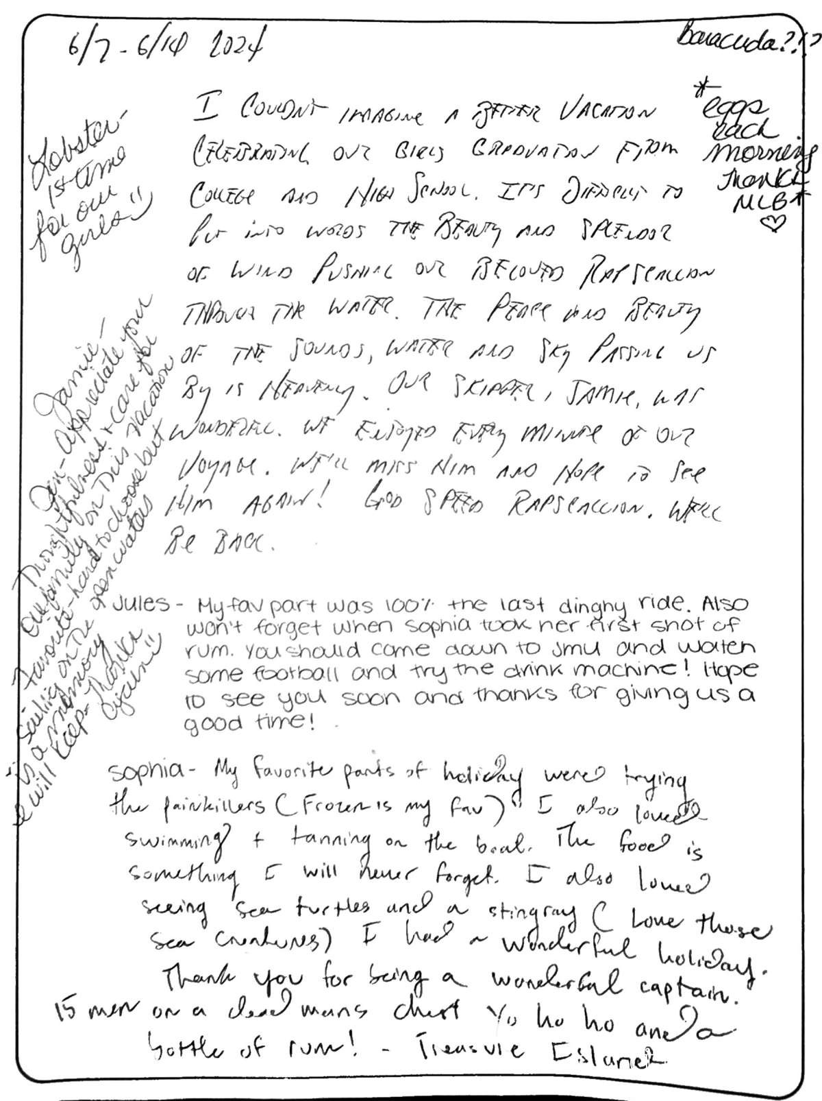 We are so very happy to have had another amazing week on Rapscallion! As always we’ve made great memories, enjoyed the best food, laughter ton, and truly love your company. We can’t wait to come back again to see our favorite USVI friends. Thanks for the journey to St. Croix and for spoiling us yet again. We will see you soon! Love Will and Dana Curry