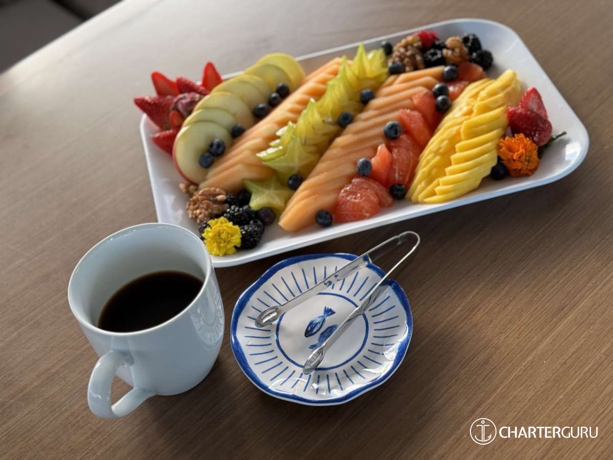 I don’t know which of you is more lucky to have the other. The highlight of our week has been you guys and your fabulous sense of humor. You have an uncanny ability to give us exactly what we want, both giving us space and being there, for laughs, for cocktails, for snacks, and constantly offering entertainment options. Steph, everyone raves about your food, and it is heavenly good. If you forced me to pick favorites, it would be the evening fish dishes, and the massive breakfasts that were perfect after an hour of wobbly dawn yoga on deck, an early morning snorkel, and plenty of coffee. BTW that coffee was always there and freshly brewed no matter what ridiculously early time I got up. I couldn’t beat Ryan out of bed, even once, although Liz managed it, but only on day one, getting up at 3:30am she was so determined not to miss a minute of vacation.