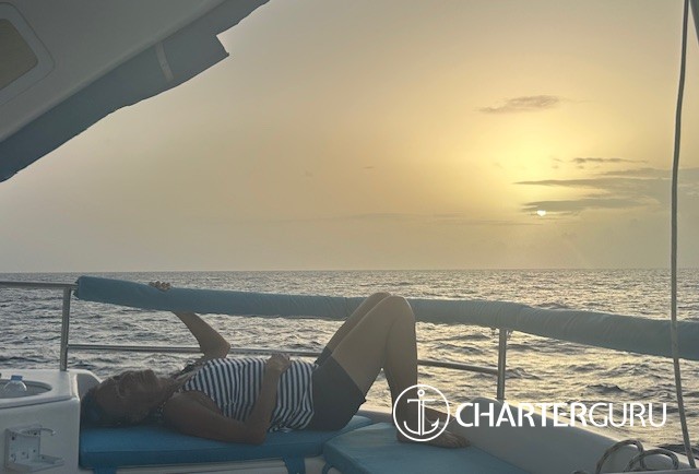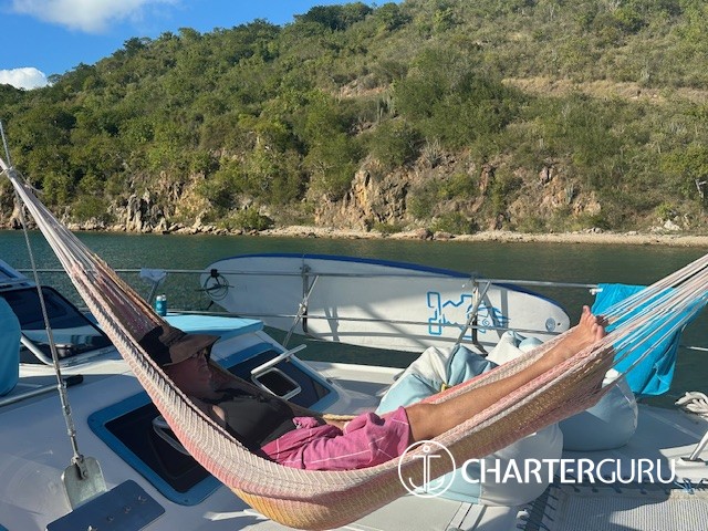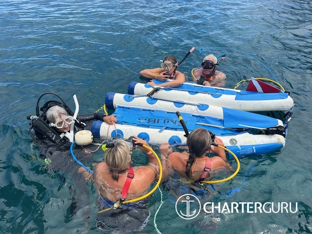 While Cheryl expertly managed the galley, Kevin took charge of our daily entertainment and activities. Each day featured one or two excellent snorkeling spots, and once we were moored for the evening, Kevin would bring out various water toys for us to enjoy. We had a great time with the paddle boards, floating island, deck chairs, and the hammock that was always set up at the bow of the boat each night. To add to the excitement, Kevin had a knee board that he towed behind his well-equipped dinghy, which my son absolutely adored. Naturally, I had to give it a try myself to ensure it was safe! 😉