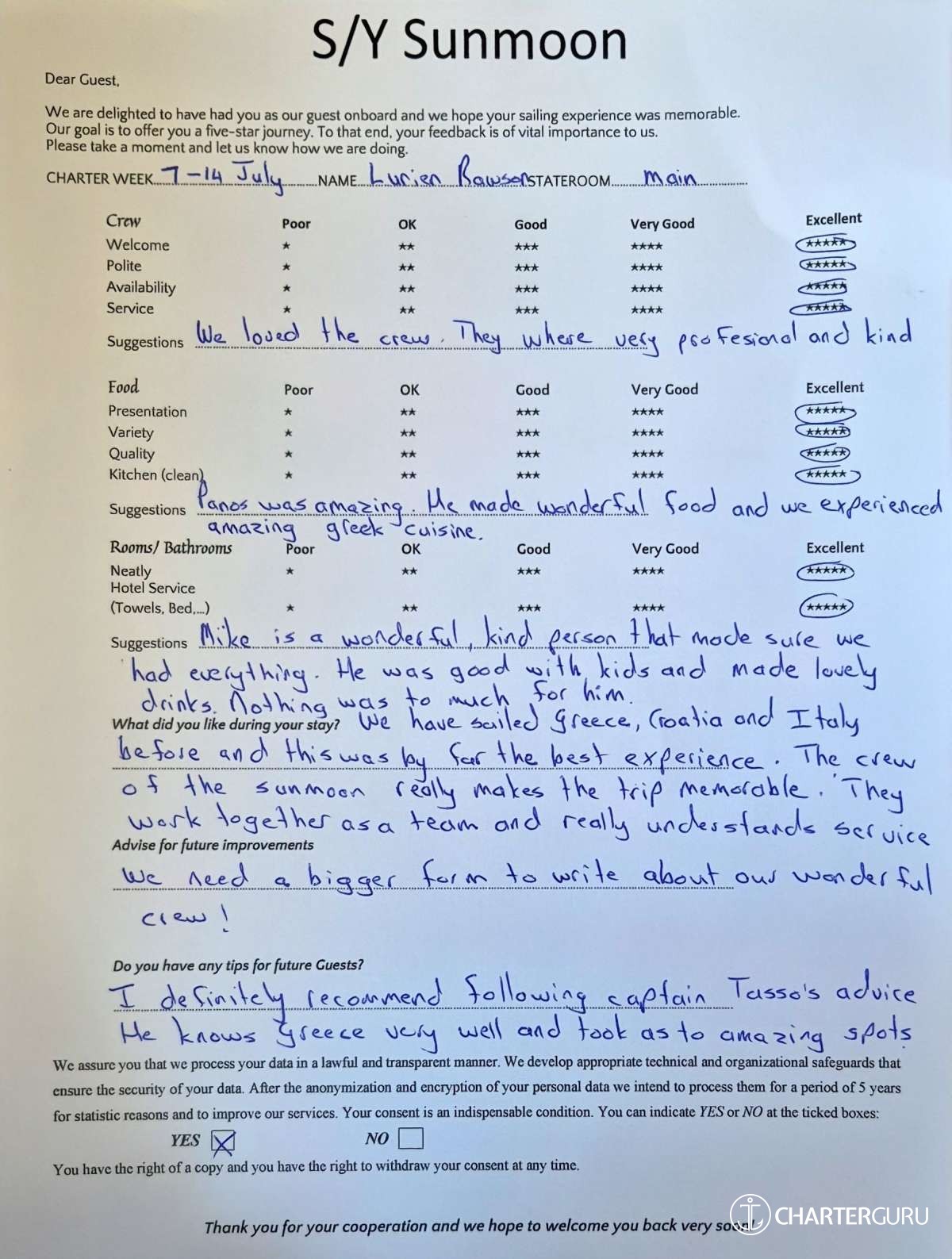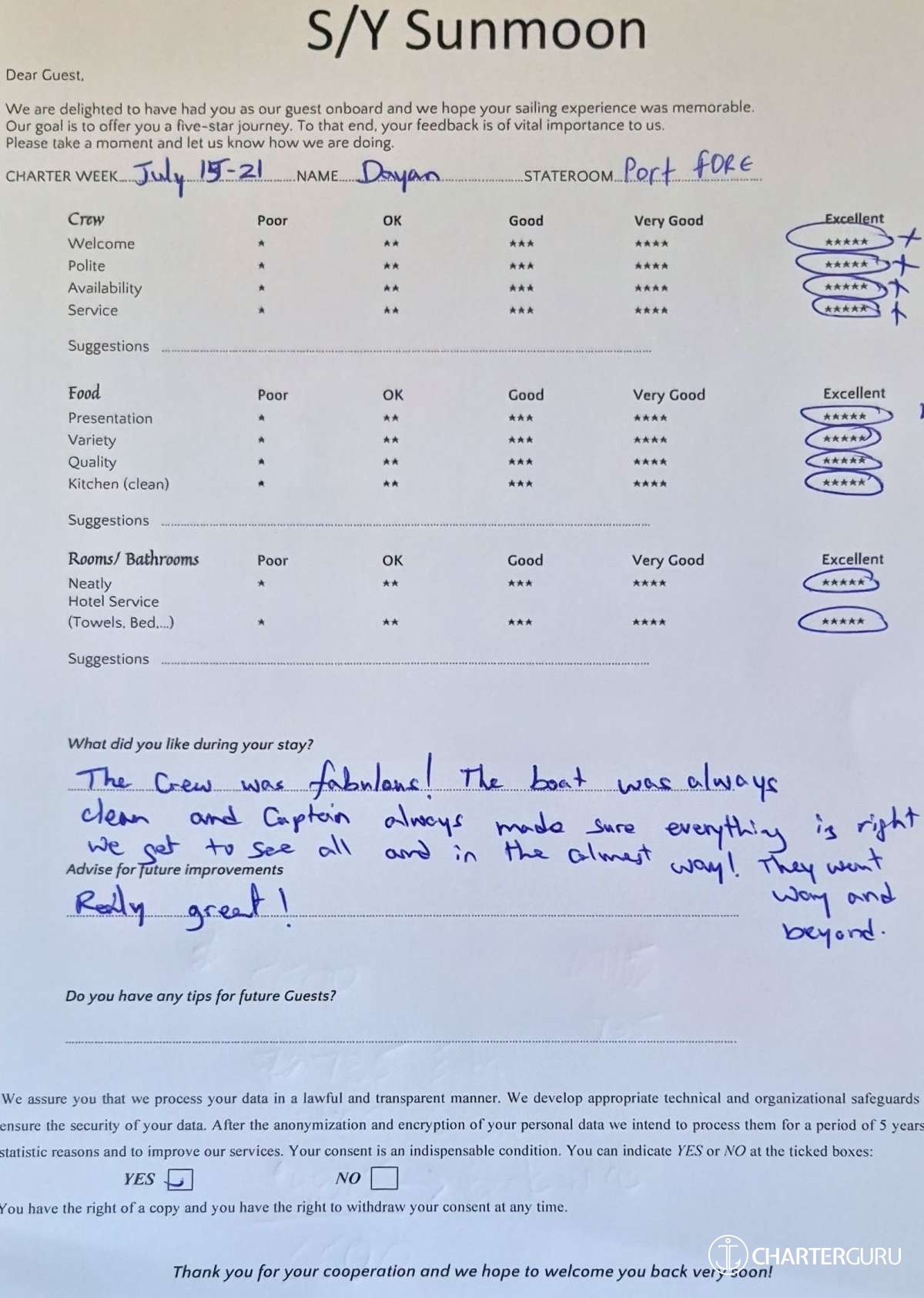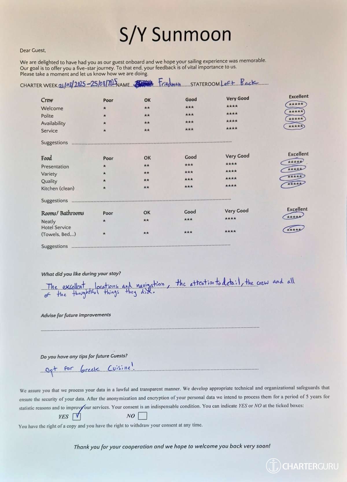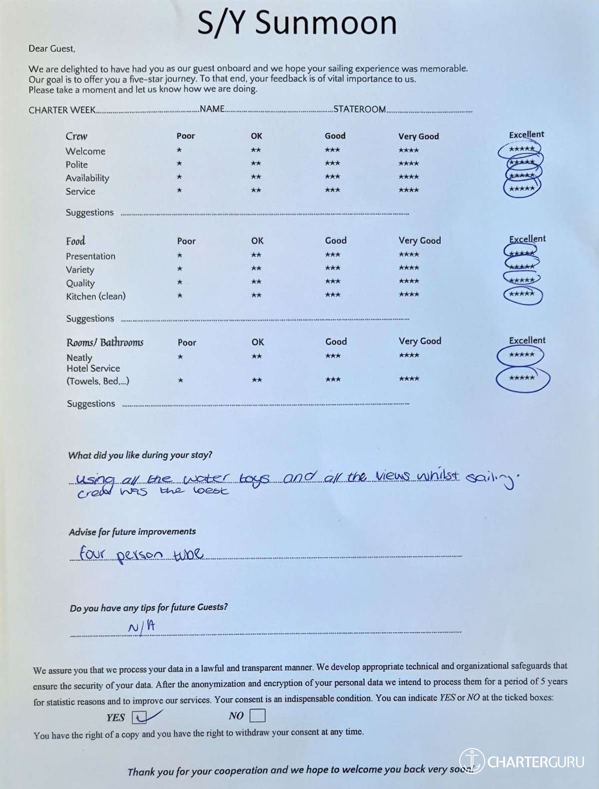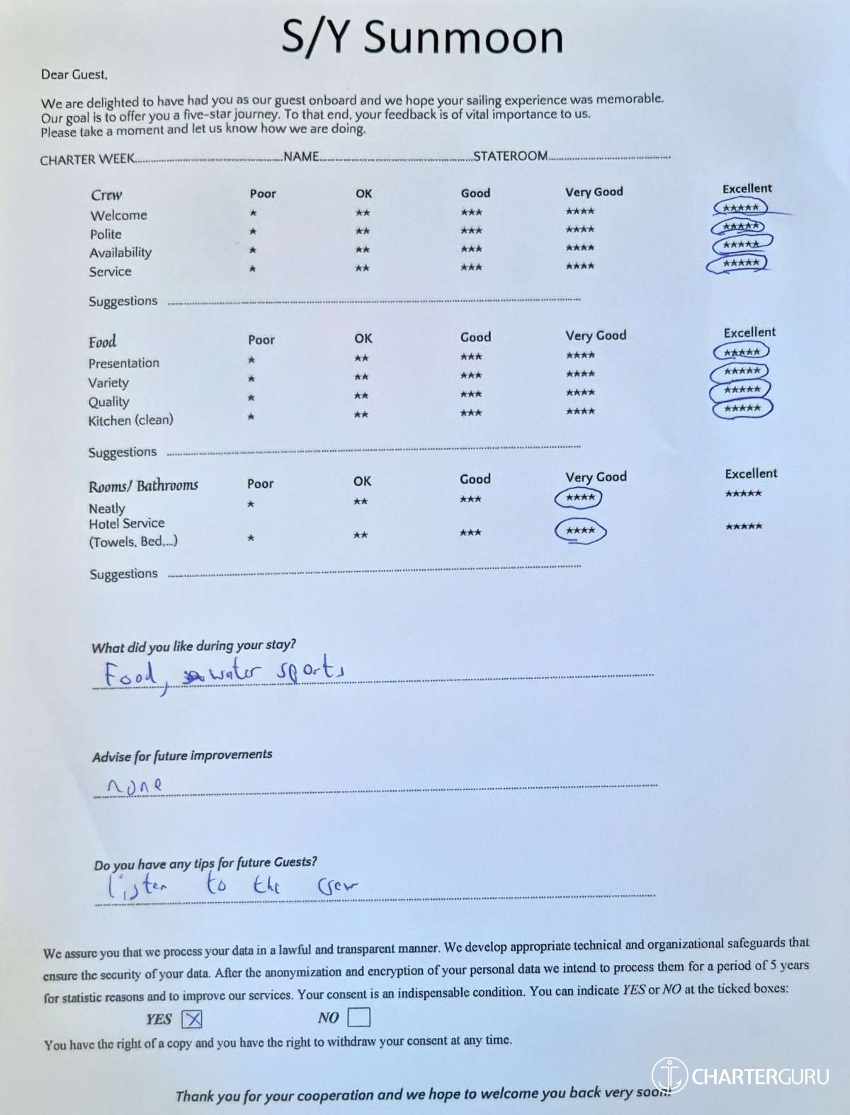 Crew gratuity is customary and ranges from 10% to 20%, it is given at the Charterer's discretion.