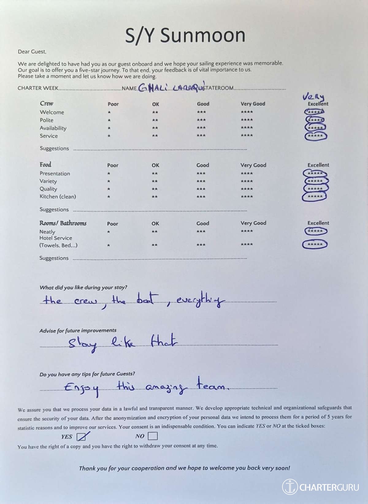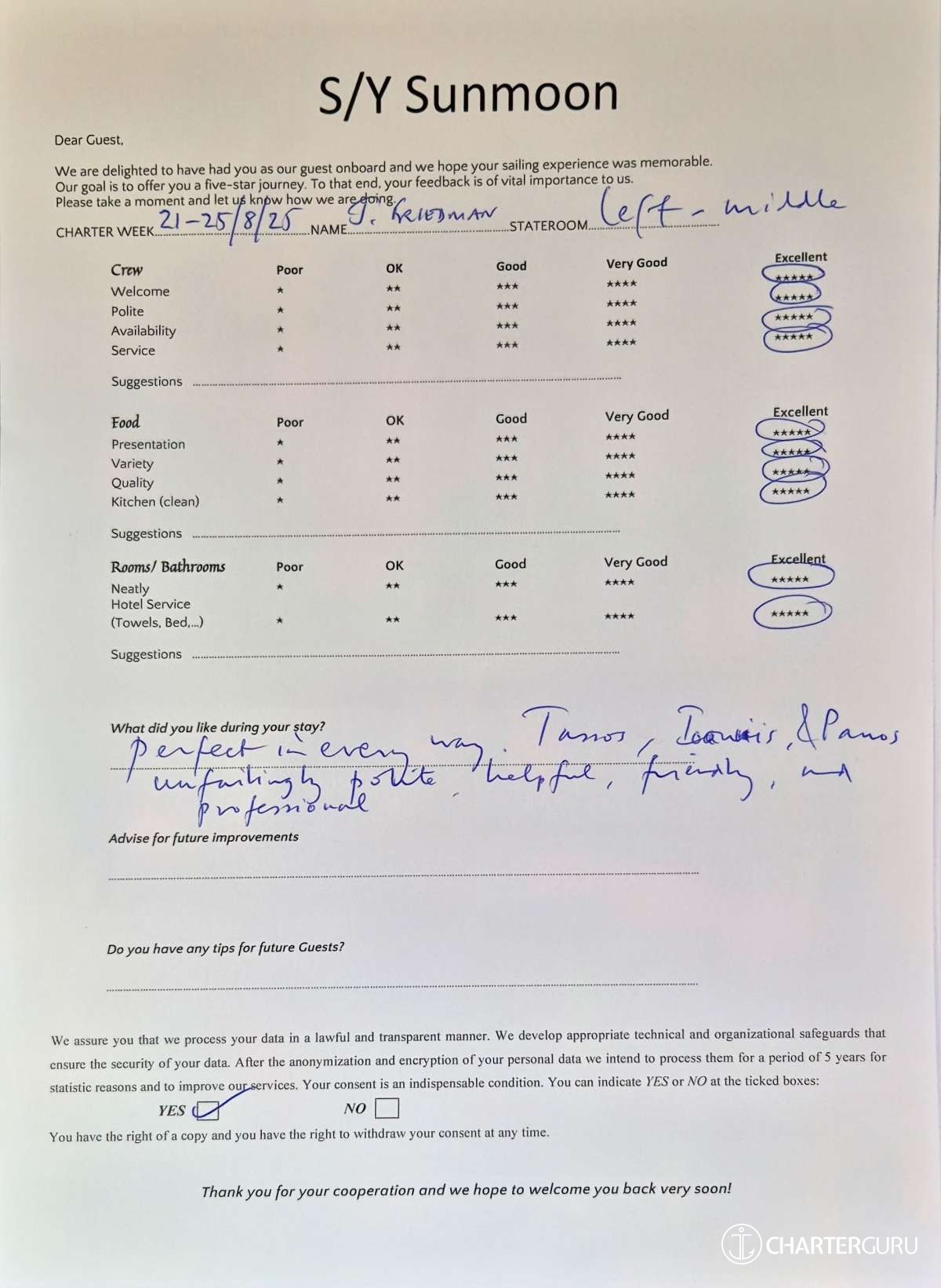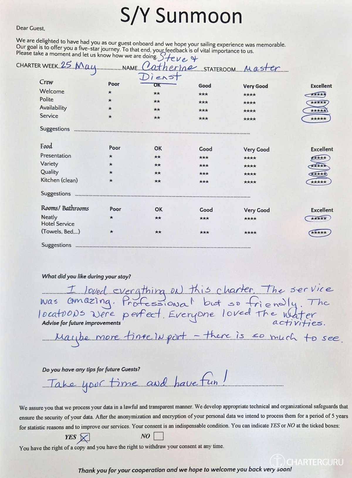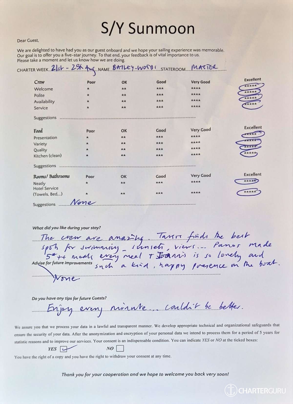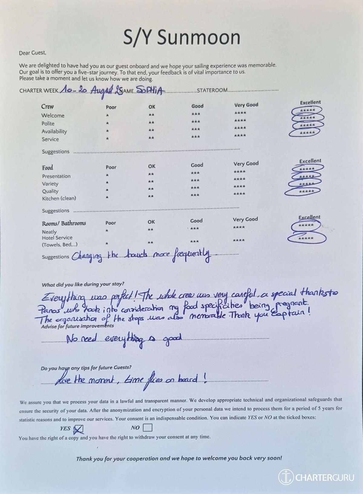 Crew gratuity is customary and ranges from 10% to 20%, it is given at the Charterer's discretion.