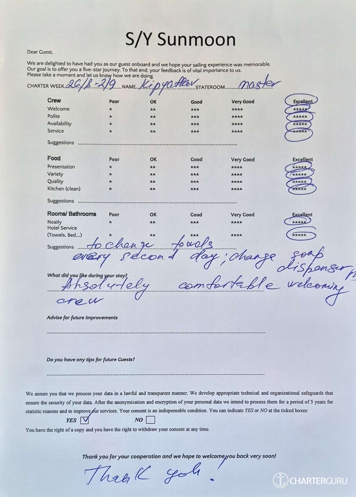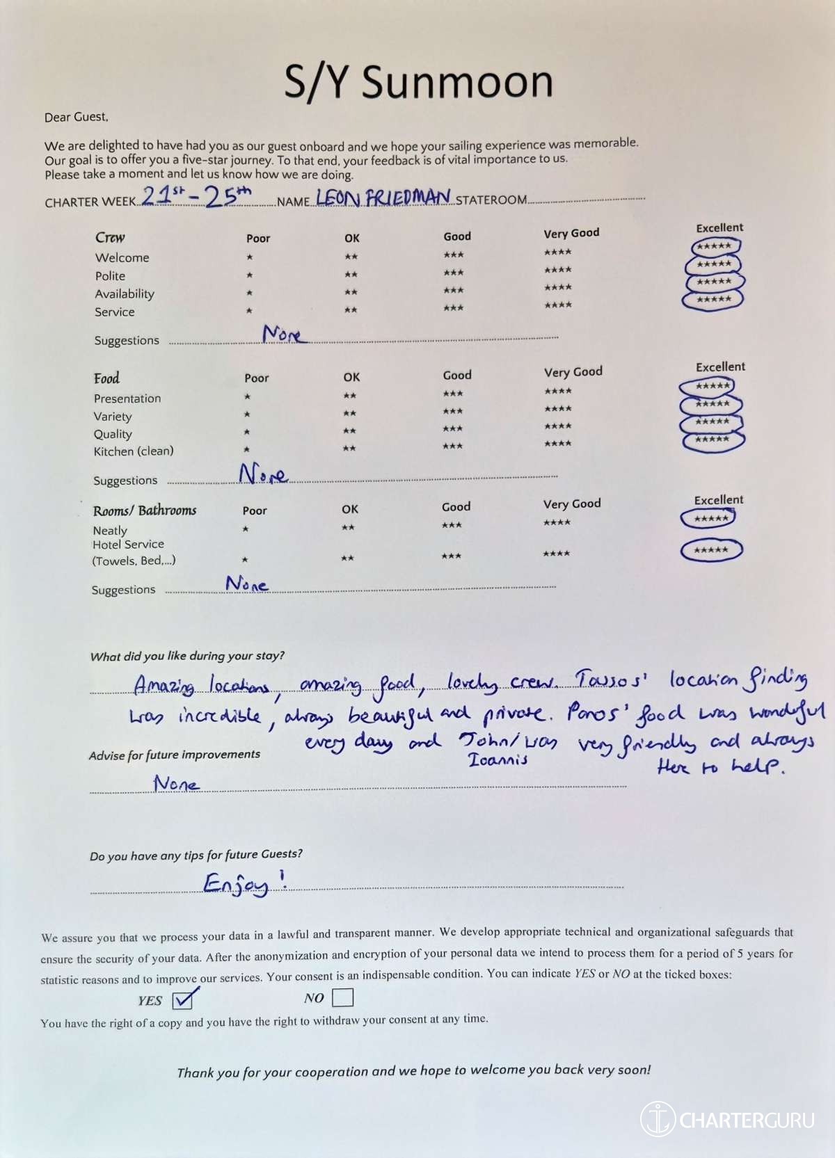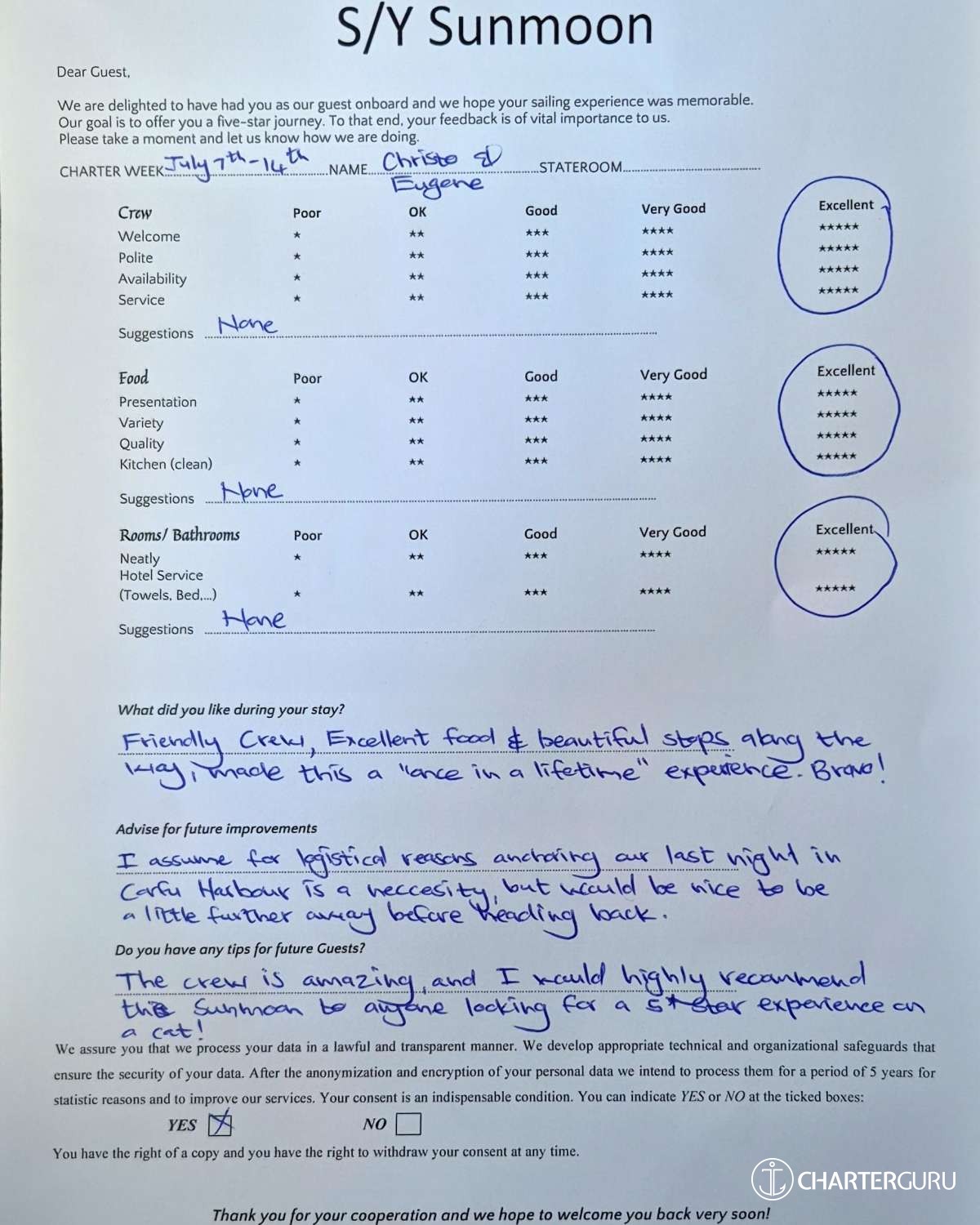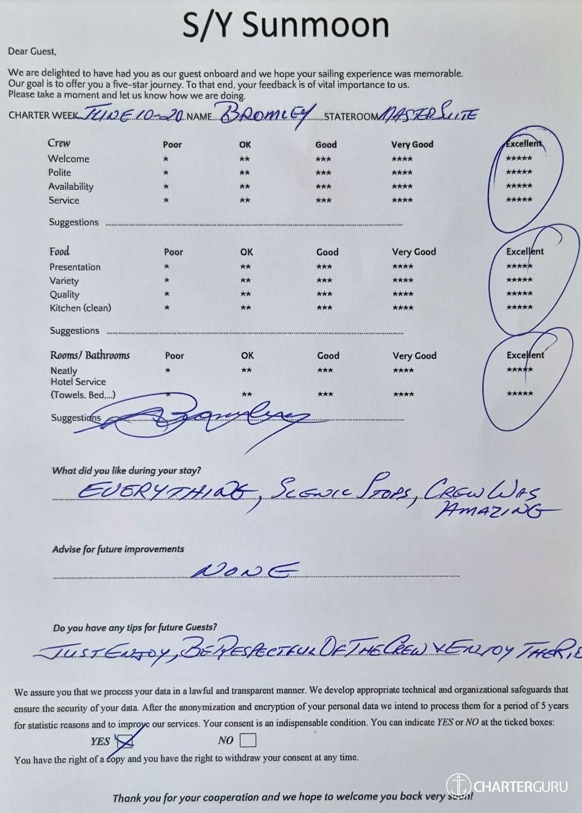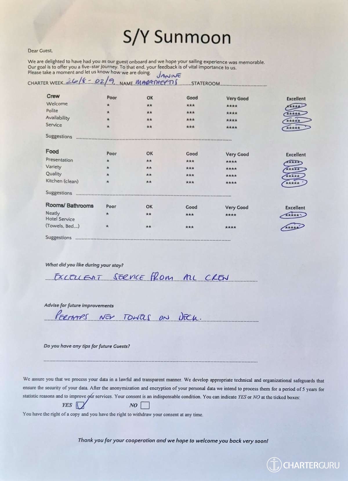 Crew gratuity is customary and ranges from 10% to 20%, it is given at the Charterer's discretion.