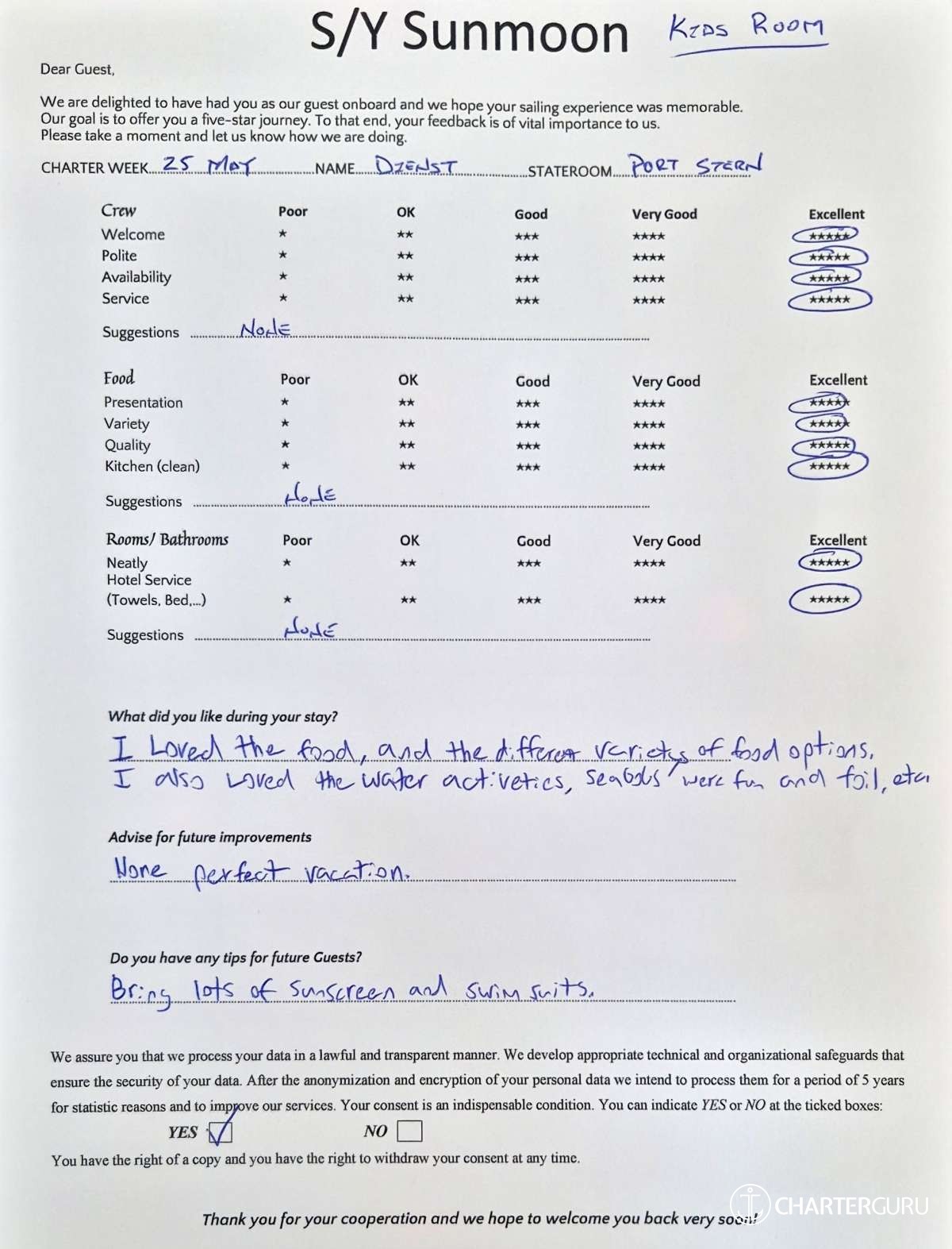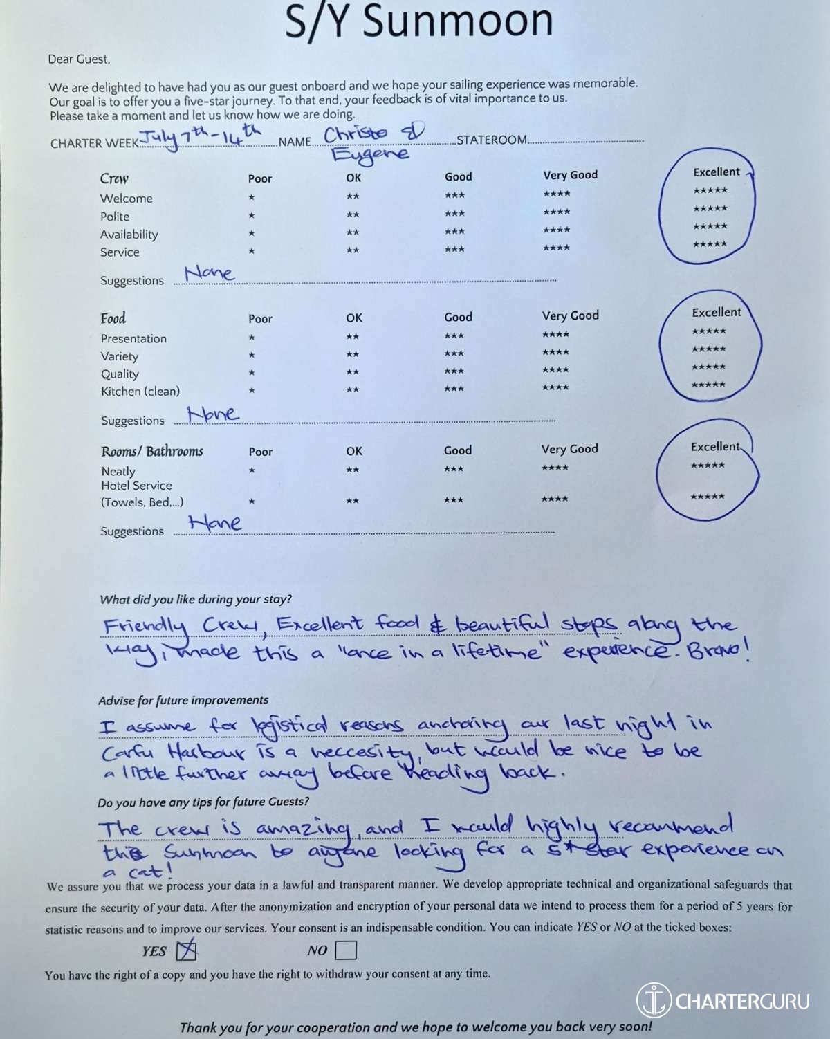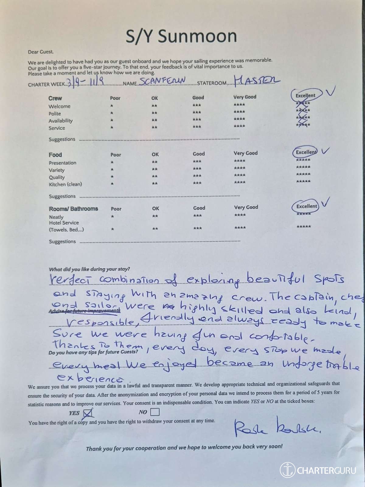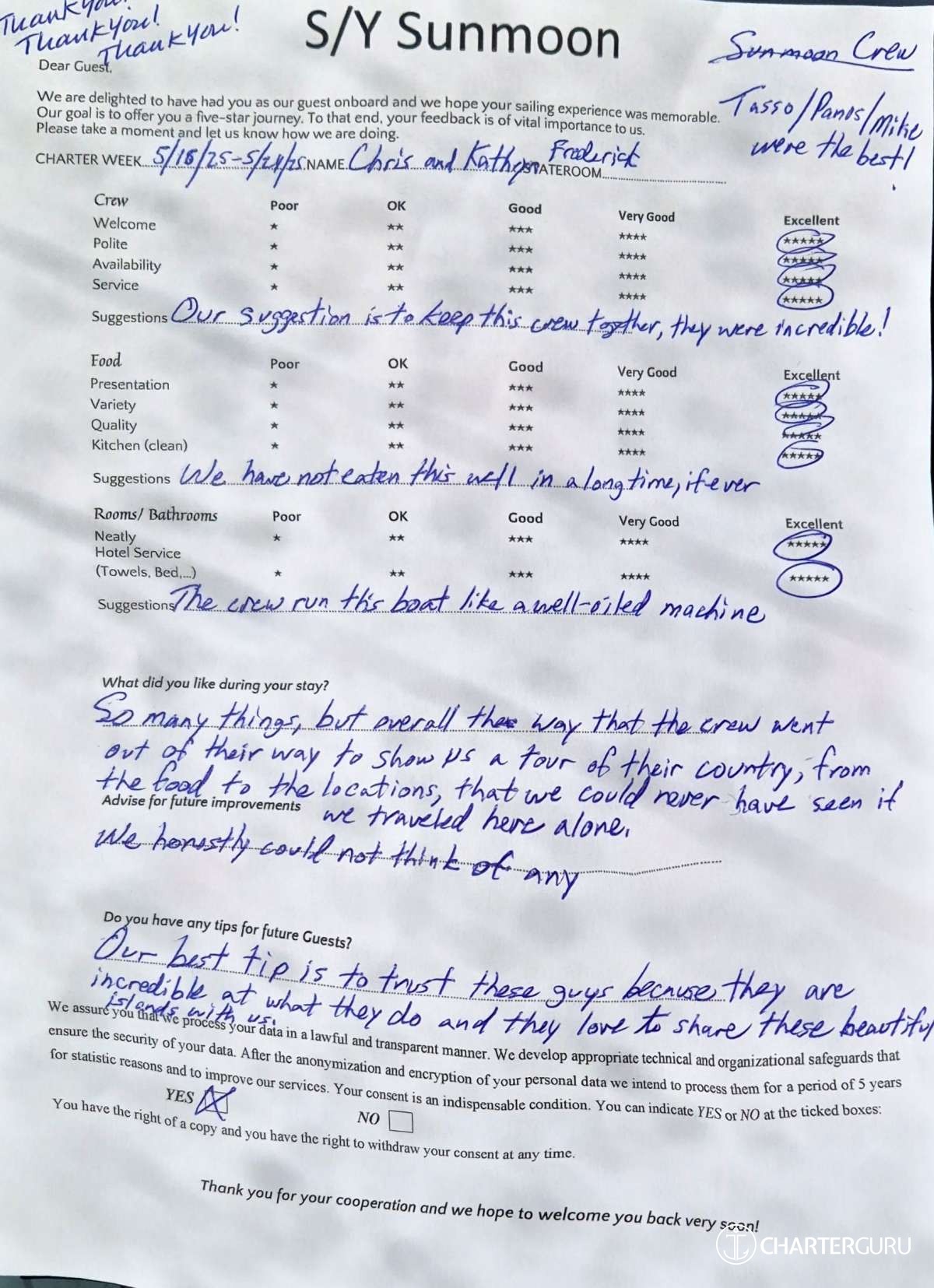 Crew gratuity is customary and ranges from 10% to 20%, it is given at the Charterer's discretion.