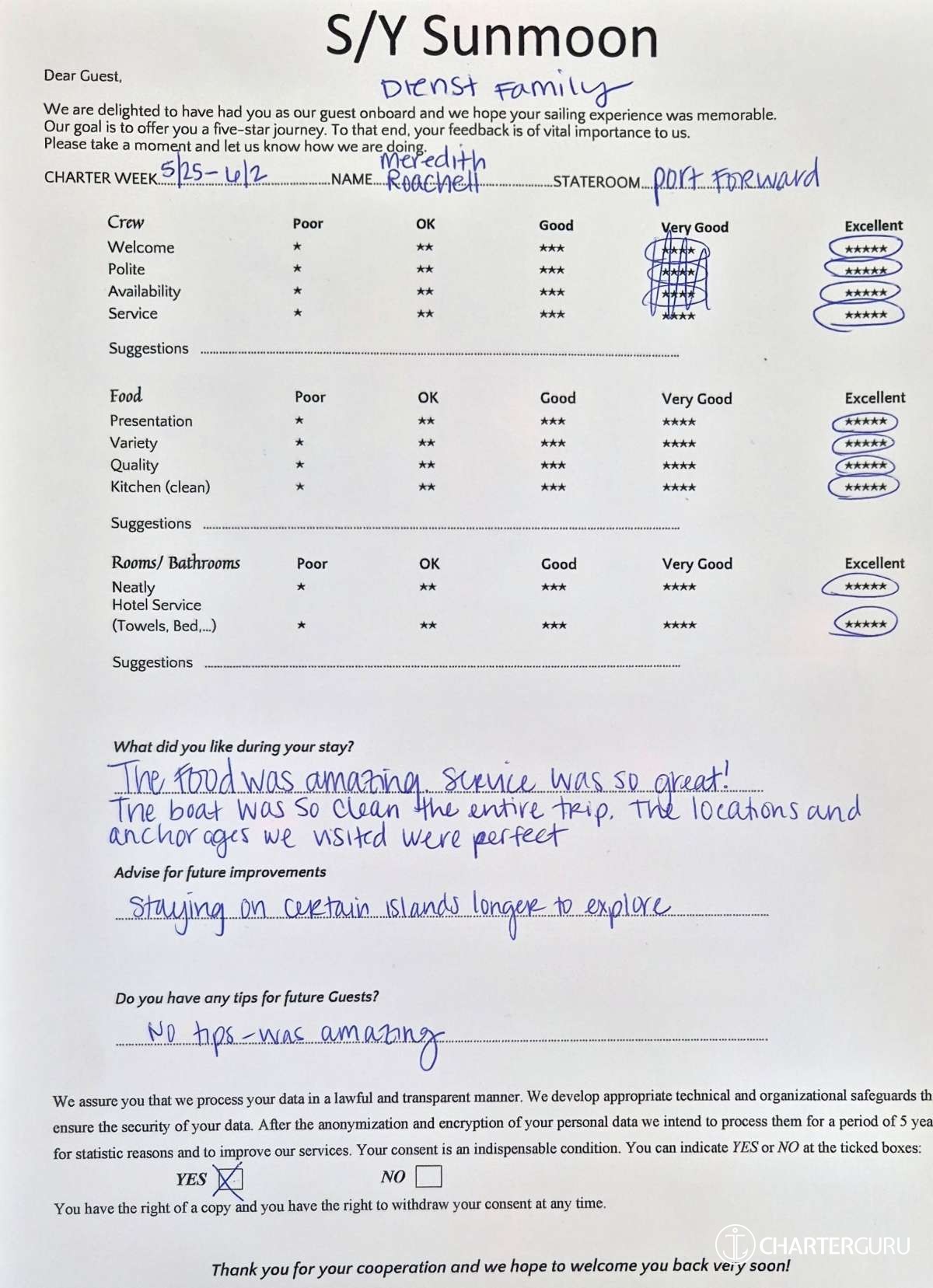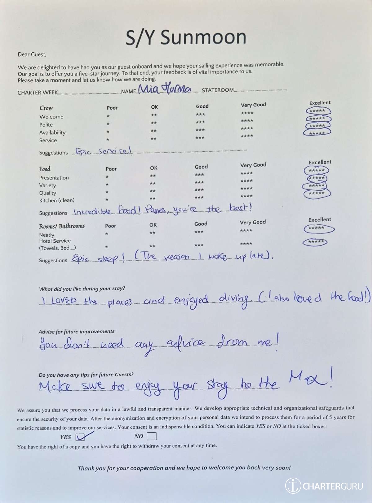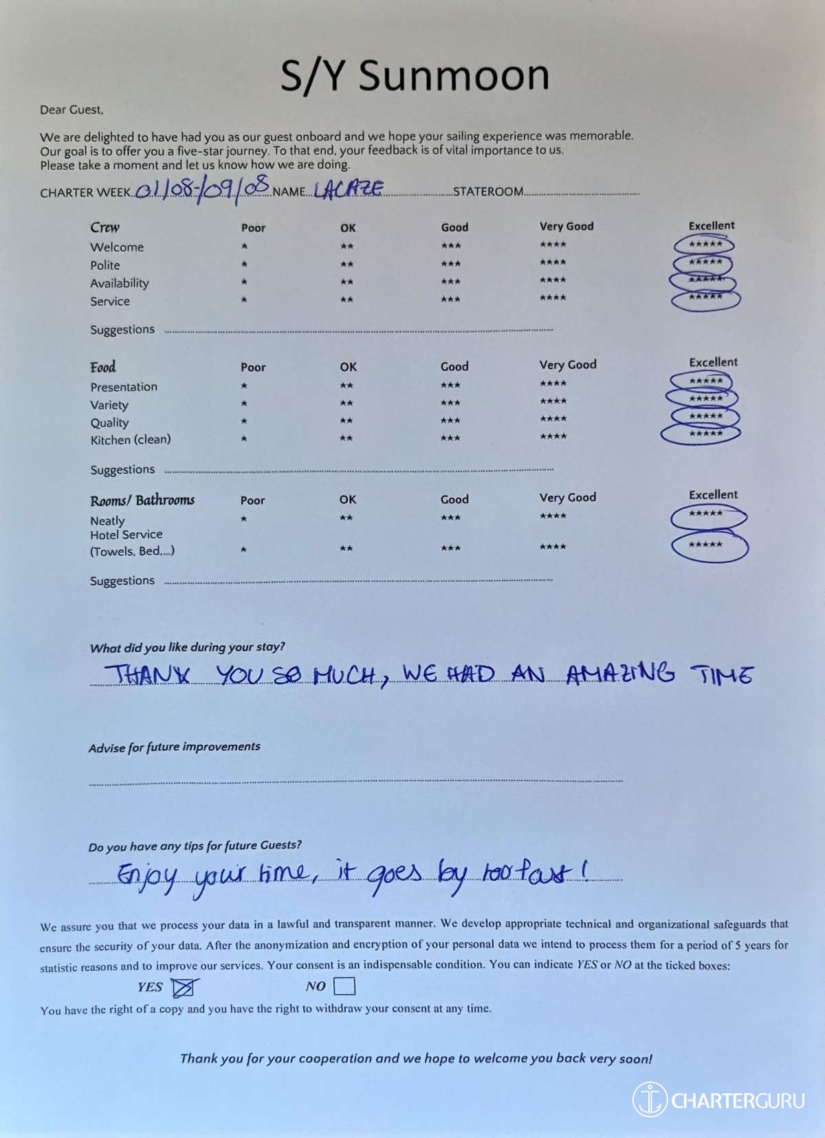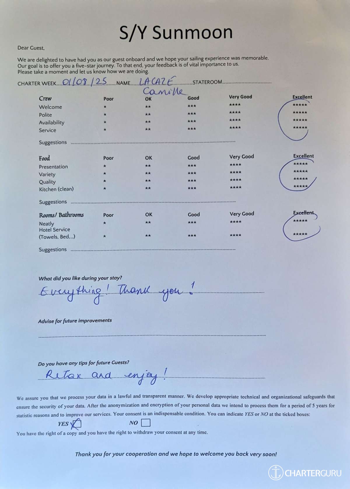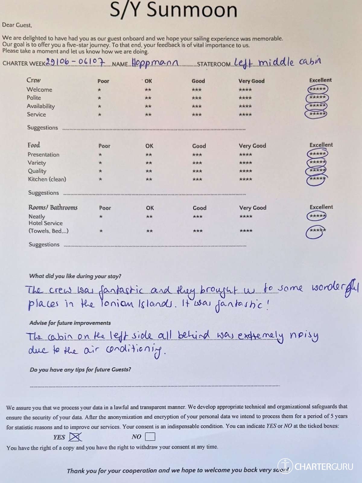 Crew gratuity is customary and ranges from 10% to 20%, it is given at the Charterer's discretion.