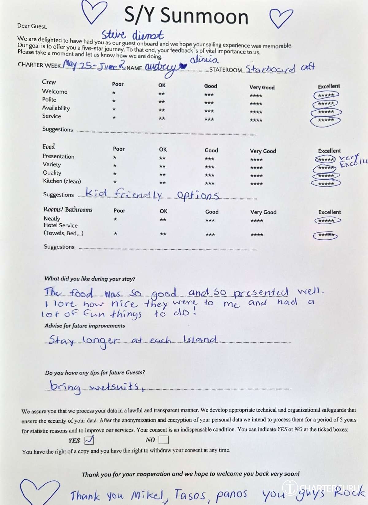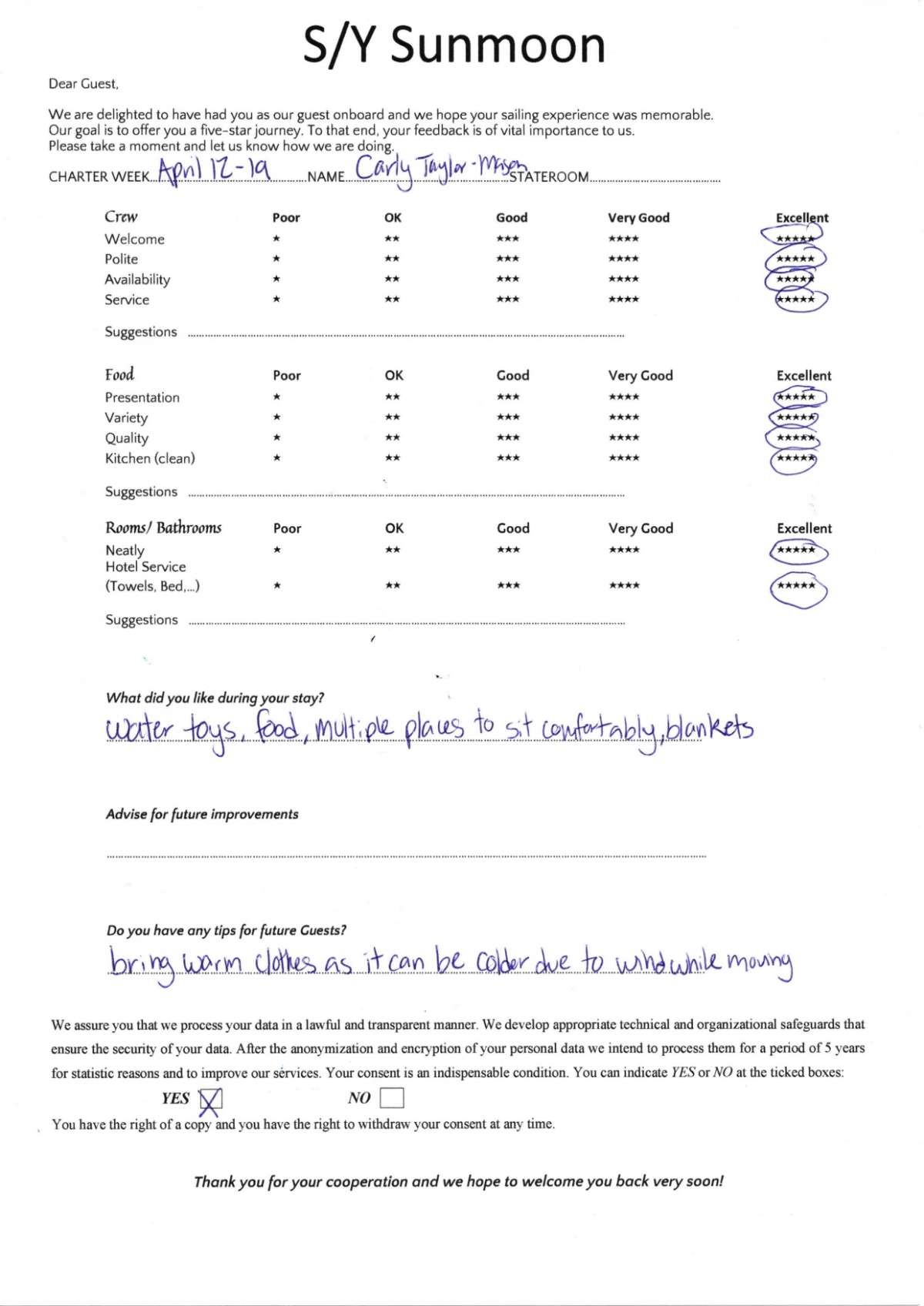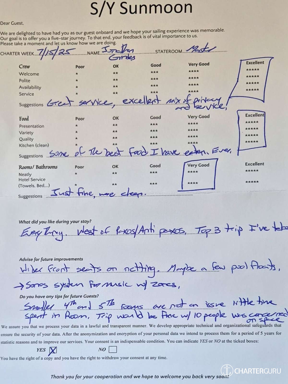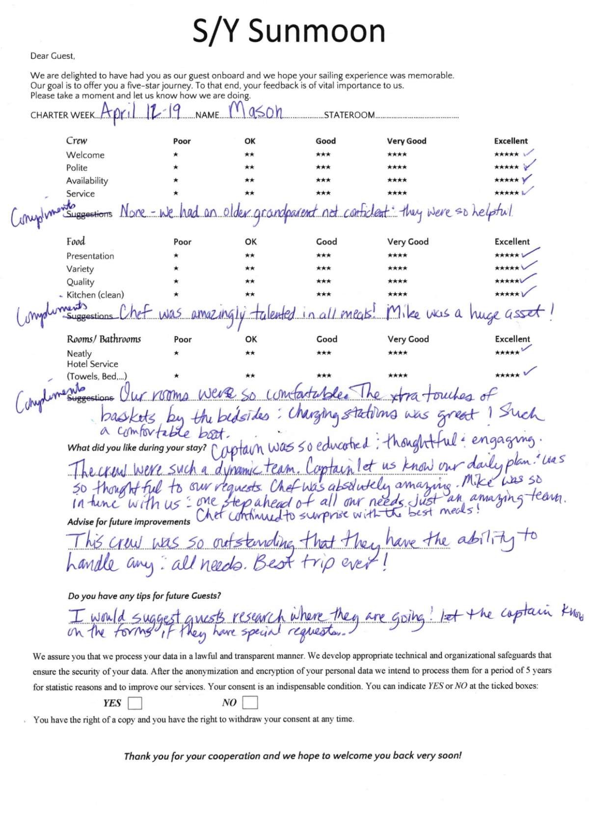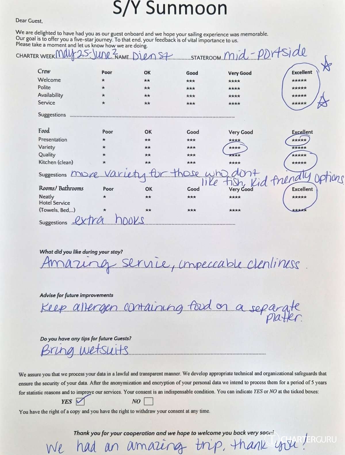 Crew gratuity is customary and ranges from 10% to 20%, it is given at the Charterer's discretion.