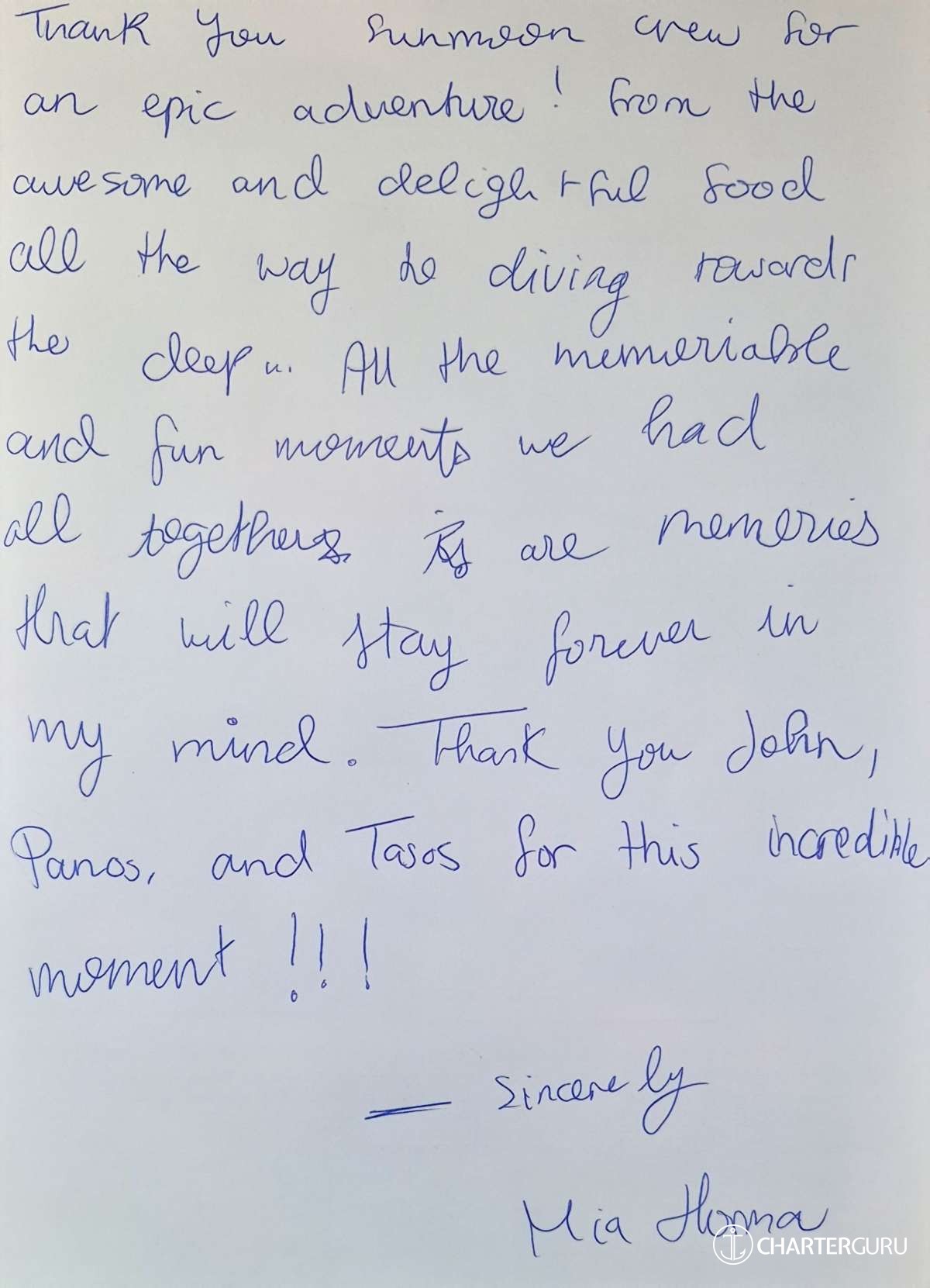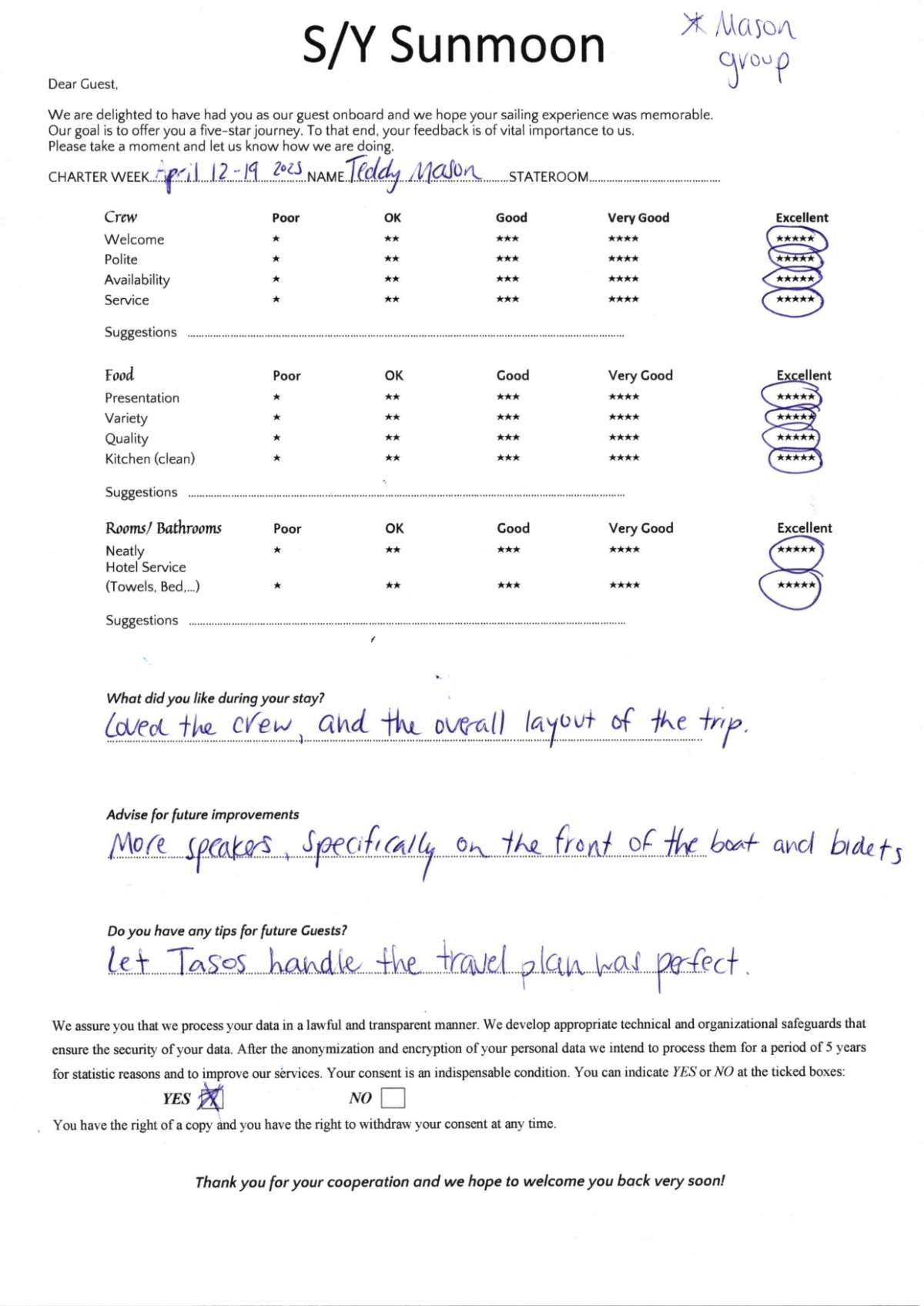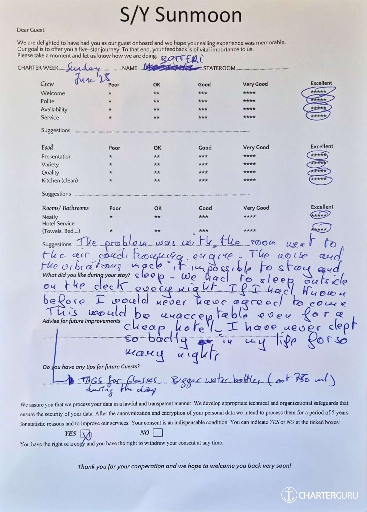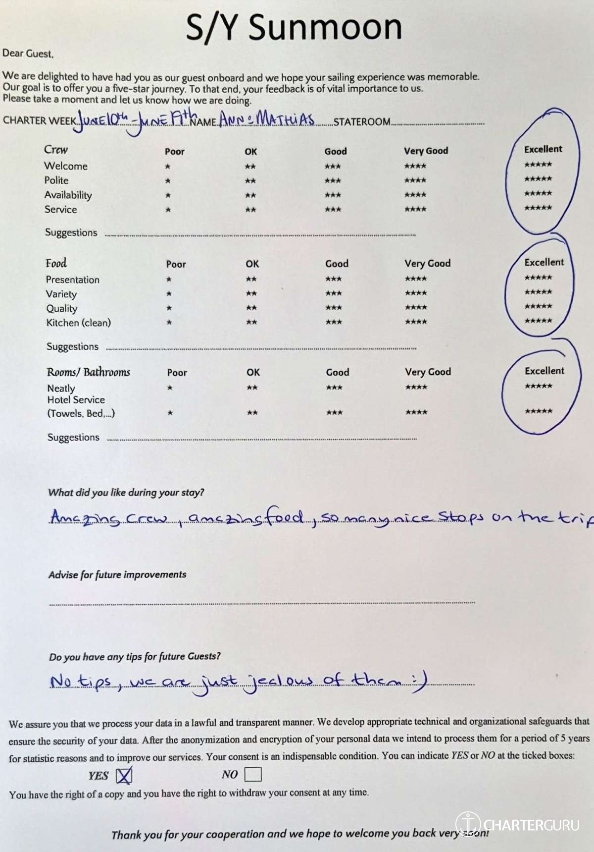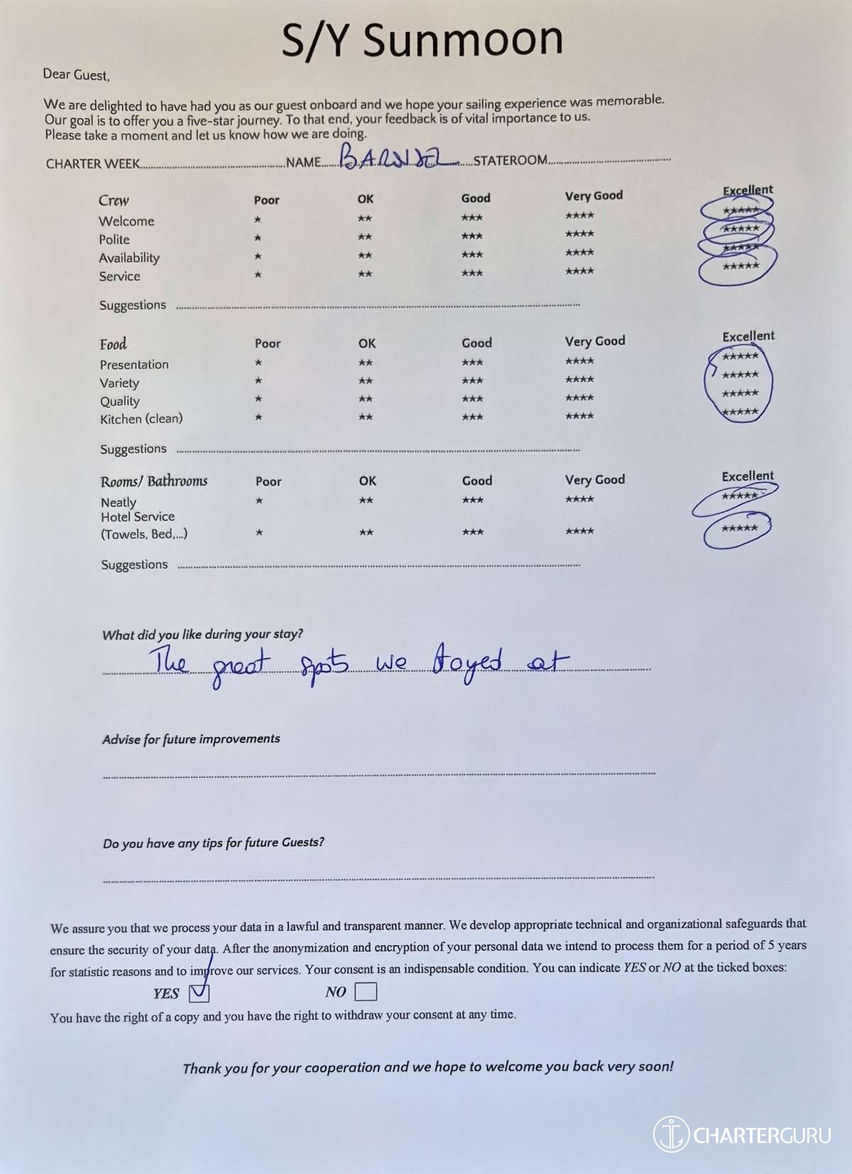 Crew gratuity is customary and ranges from 10% to 20%, it is given at the Charterer's discretion.
